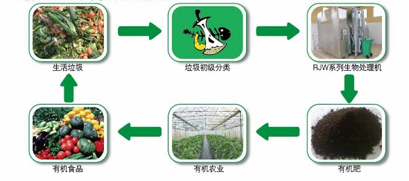 机废弃物为养分,通过自主研制的RJ系列有机垃圾生化处理机为高效降解有机物的微生物菌种