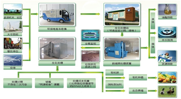 可根据实际情况,采用分散或集中生化处理餐厨垃圾,占地极小、不需二次运输、操作便